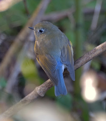Calling from the thick grows of trees and bushes; she came out to check us out: Red-flanked Bluetail ♀, ルリビタキ