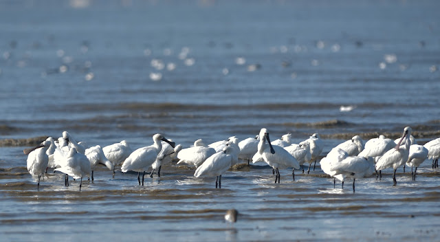 The weather was clear. Sunny and warm. The sunlight a bit too strong for the camera, There was a big flock of Spoonbills, I counted about 60 on one side of the area. Another group was further west. I can see the Black-faced Spoonbills every day in winter in Fukuoka, but not often this close in big numbers.