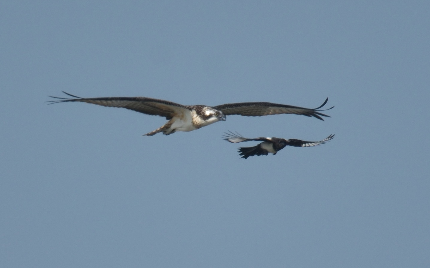There were few small birds, a raptor must be around. I expected a falcon, but instead an Osprey, ミサゴ was at that place. A family of obnoxious Magpies, カササギ checked him out.