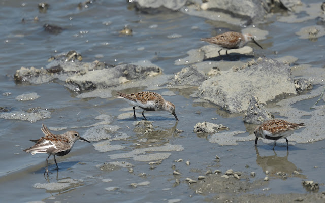 These 2 birds in their summer outfit came close to the quay to find food. Watch those faces! Their Japanese name means monkey dunlin, referring to the monkey type markings. I don't see much of a monkey face in there myself, but they look funny.