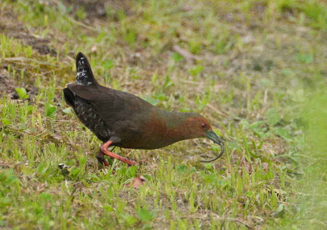 At lunchtime, in the middle of a hot day, a Ruddy-breasted Crake, ヒクイナ came out of the swamp in a park to get some food. Is there a nest in there?